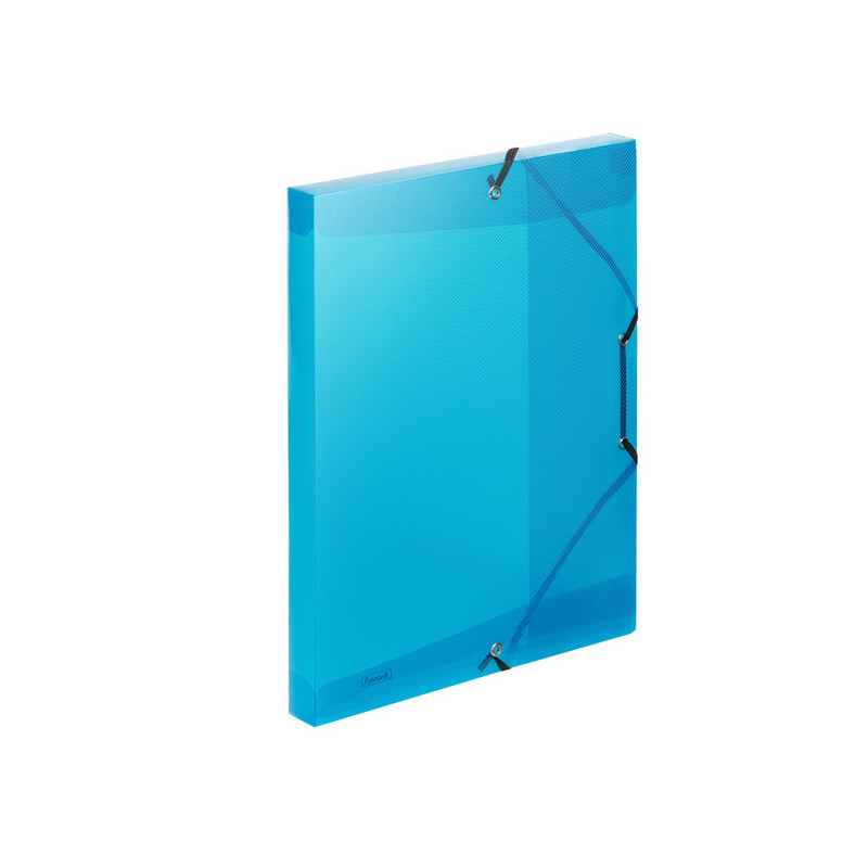Realizzati in polipropilene trasparente colorato con speciale finitura rigata. Chiusura con elastico piatto di colore nero. Disponibili in 5 colori: arancio, verde, fucsia, azzurro e neutro. Made in China.