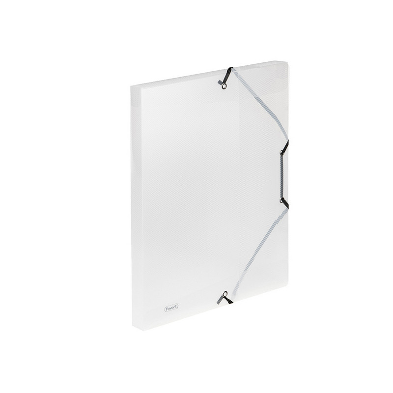 Cartelle realizzate in polipropilene trasparente con speciale finitura rigata. Chiusura con elastico piatto di colore nero. Formato utile: 24x32cm. Dorso 2,5cm. Made in China.
