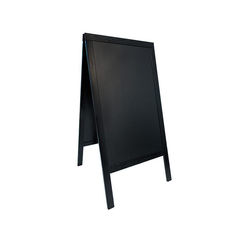 Lavagna nera da terra a cavalletto con doppia faccia. Cornice in legno duro con tripla laccatura che la rende idonea all'utilizzo anche in esterno. Superficie scrivibile con pennarelli a gesso liquido, antigraffio, resistente ai raggi uv e alle deformazioni dovute al calore.