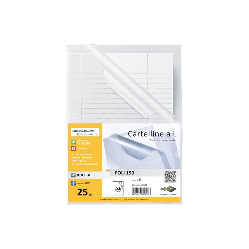 Cartelline in PP trasparente a buccia, alto spessore, con apertura a L e lunetta laterale per facilitare l'inserimento o l'estrazione. Ideali per archiviare fax, fotocopie e documenti di facile consultazione. Formato interno 210x297mm. Formato esterno 232x322mm. Confezione da 25 cartelline.