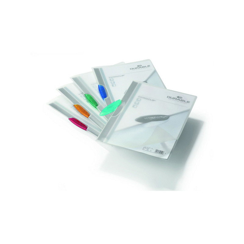 Cartellina in polipropilene flessibile trasparente con clip in plastica colorata a forma di ellisse, ruotabile di 180°. Ideale per presentare e archiviare, in modo moderno e vivace, documenti non perforati. La cartellina può essere aperta senza dover sganciare la clip, in questo modo i documenti restano bloccati durante la consultazione. Capacità 1-30. Formato utile 21x29.7cm.