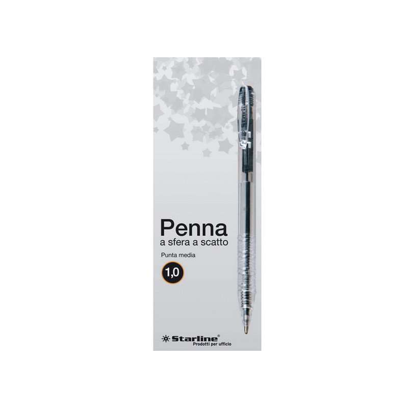 Penna a sfera a scatto STARLINE economica e di ottima qualità. Fusto trasparente. Pulsante del colore dell’inchiostro. Punta media 1,0mm. Colore: nero.