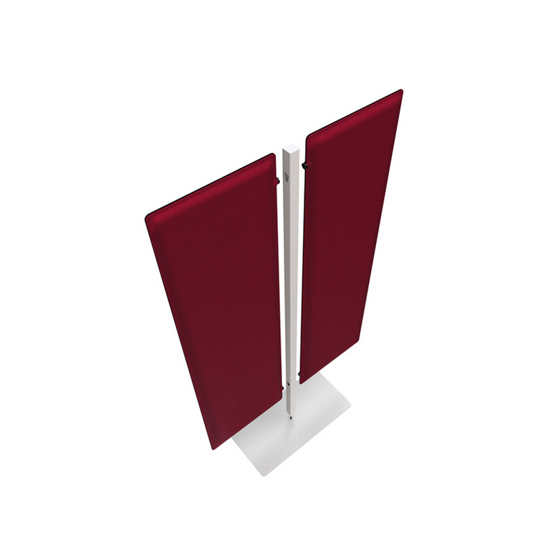 Struttura autoportante con piantana in alluminio allestita con 2 pannelli Moody fonoassorbenti. I pannelli acustici sono in fibra di poliestere, realizzati con materiale riciclato, composti di più strati accoppiati di densità variabile con tessuto esterno Mirage in colori standard. Ideale come divisorio mobile per creare aree di privacy visiva ed acustica. Piantana in alluminio H180 x L83,8cm (formata da 2 pannelli Moody 160x40cm).