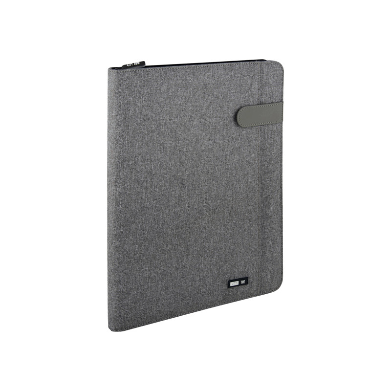 Portablocco in tessuto tecnico e chiusura in ecopelle. Formato A4 chiusura con zip, tasca esterna con chiusura a bottone, scomparti per biglietti, tasca interna portadocumenti, portapenna, completo di blocco.