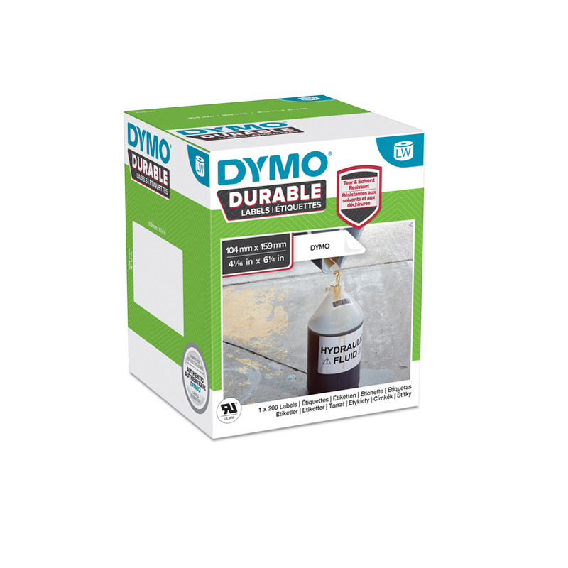 Rotolo di etichette permanenti LabelWriterTM DURABLE in polipropilene resistenti allo strappo con adesivo extra-lungo resistente all 'abrasione, ai comuni detergenti e a un'ampia gamma di temperature. Ideali per scaffali, archivi e segnaletica.