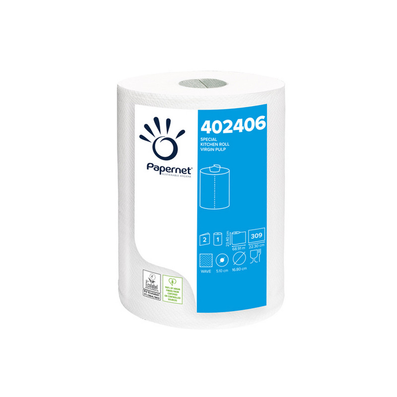 SPECIAL ROTOLO DA CUCINA A 2 VELI IN PURA CELLULOSA. GOFFRATO ONDA DIAMETRO EST.16,8CM (DIAMETRO INT. 5CM) H23CM LUNGHEZZA69,5MT. 309 STRAPPI DA 22,5CM DI LUNGHEZZA. IDONEO AL CONTATTO CON GLI ALIMENTI.