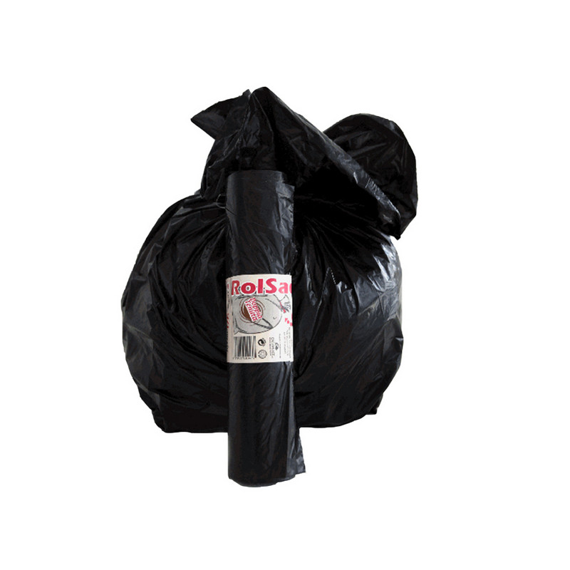 Sacchi pattumiera di colore nero in MDPE rigenerato + PLT lineare. Formato 55x70cm 38Lt 19µ. In rotolo compatto da 30 sacchi con fascetta. Prodotto con alta resistenza meccanica.