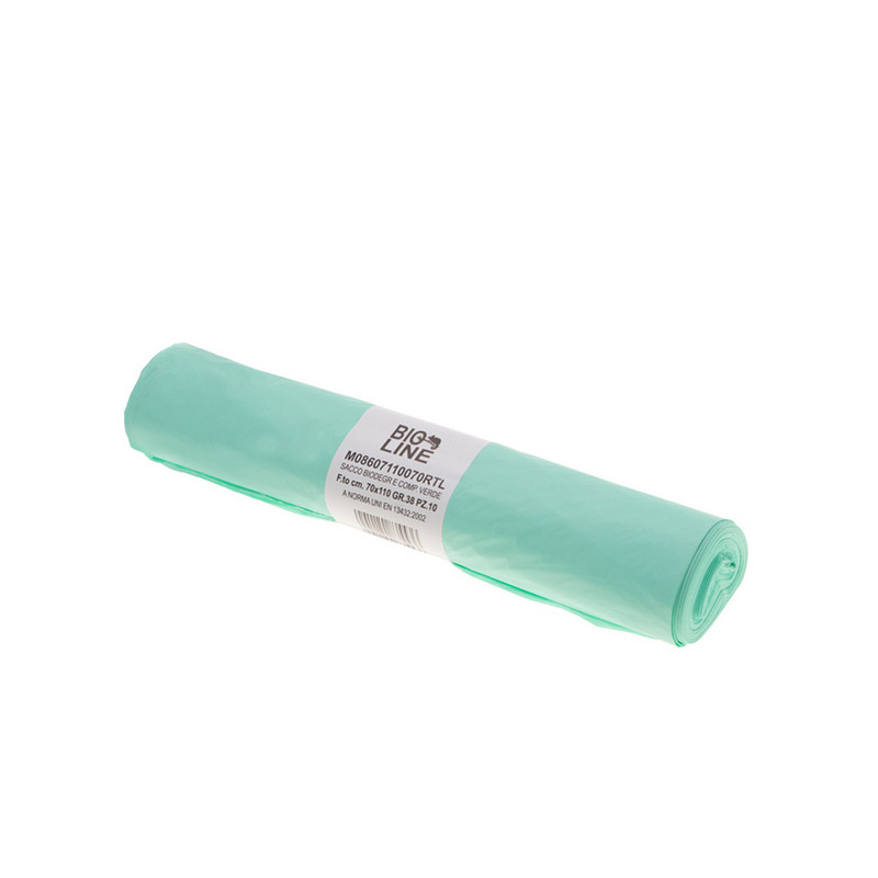 Sacchi pattumiera di colore verde in BIOPOLIMERO BIODEGRABILE e COMPOSTABILE (UNI EN 13432). Formato 70x110cm 110Lt 18µ. In rotolo da 10 sacchi. Prodotto con alta resistenza meccanica adatti alla raccolta della frazione umida.