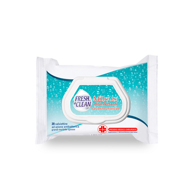 Salviettine ad azione antibatterica per la disinfezione rapida della cute delle mani, del viso e delle varie parti del corpo, e in tutte quelle situazioni in cui non sia disponibile l’acqua e sia necessaria un’azione disinfettante. Indicate anche prima di iniezioni intramuscolari. Sono utili in casa e fuori. Sono Presidio Medico Chirurgico.