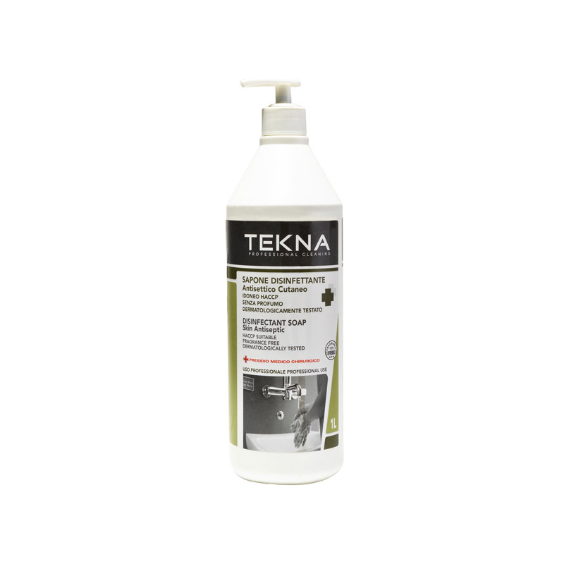 Sapone disinfettante, antisettico liquido cutaneo dermatologicamente testato, non profumato con dispenser. Certificato Presidio medico Chirurgico e Haccp. Indicato anche per lavaggi frequenti. Svolge un'efficace azione disinfettante ed elimina la carica batterica presente sulla cute senza alterarne l'equilibrio fisiologico. Idoneo per il settore alimentare.