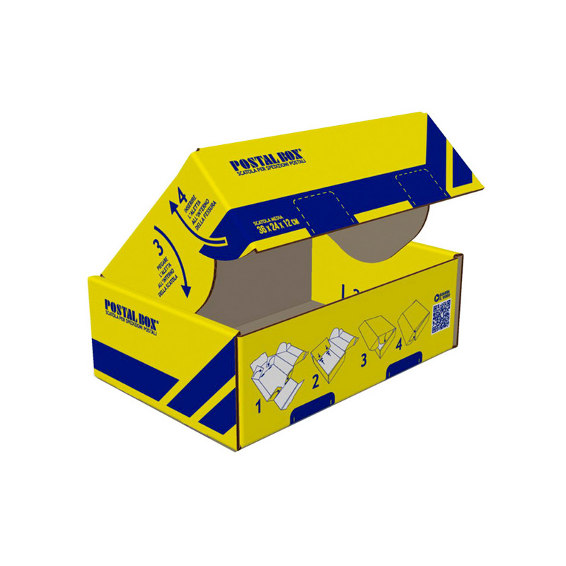 Scatola per spedizione postale di facile assemblaggio. Cartone esterno patinato. Comprende: busta trasparente portadocumenti (POLYADEX), etichetta adesiva MITTENTE/DESTINATARIO, sigilli antieffrazioni con rilascio scritta VOID.