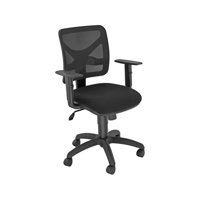 Seduta operativa con schienale medio in rete nera. Meccanismo a contatto permanente. Elevazione a gas. Base in nylon con ruote. Rivestimento in tessuto acrilico 100%. Braccioli regolabili inclusi.
