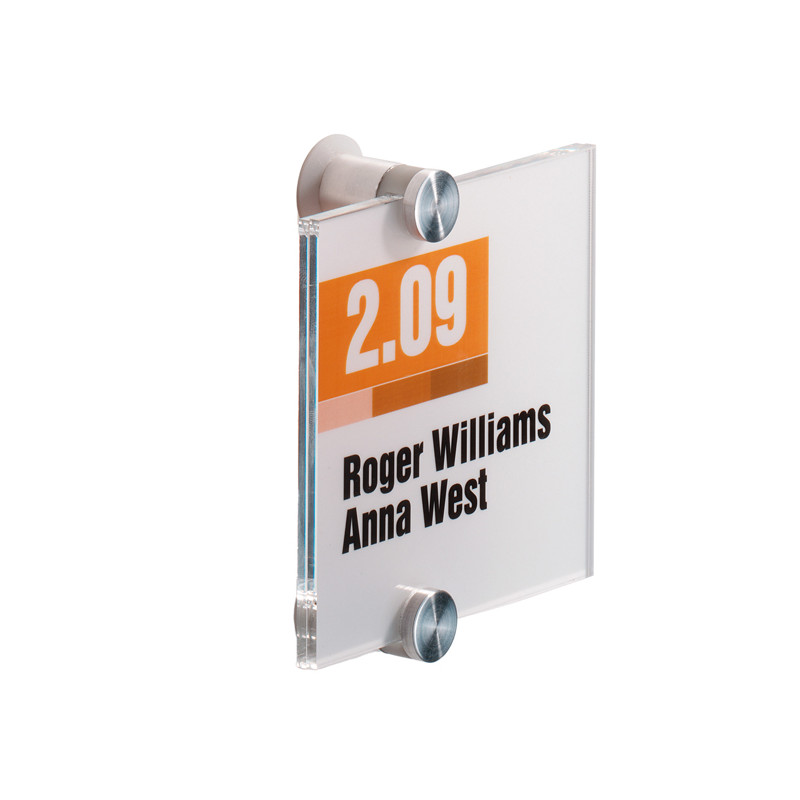 Targa professionale per porte e pareti dal design semplice ed elegante in acrilico di alta qualità, può essere perfettamente adattata al vostro corporate design grazie ai 2 fogli inserto A4 semi tranlucidi pretagliati inclusi nella confezione. I pannelli in acrilico trasparente e gli inserti semi translucidi, sono l'ideale per ogni tipo di ambiente. Kit per il fissaggio con viti e istruzioni di montaggio incluso. Formato targa 105 x 105 mm.