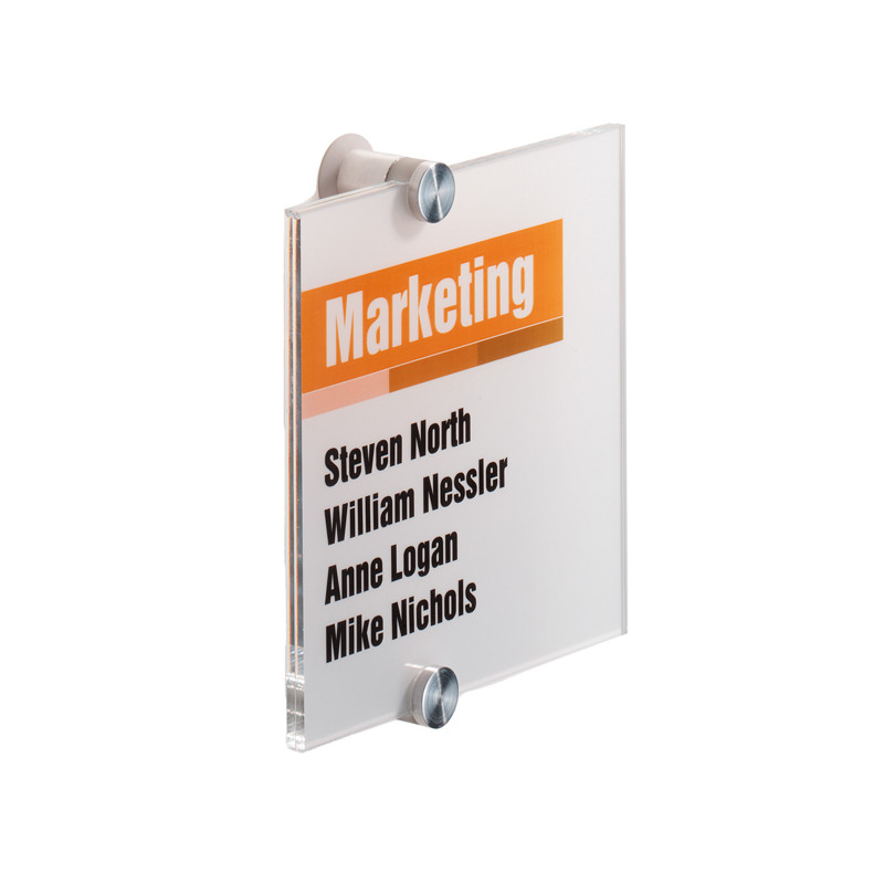 Targa professionale per porte e pareti dal design semplice ed elegante in acrilico di alta qualità, può essere perfettamente adattata al vostro corporate design grazie ai 2 fogli inserto A4 semi tranlucidi pretagliati inclusi nella confezione. I pannelli in acrilico trasparente e gli inserti semi translucidi, sono l'ideale per ogni tipo di ambiente. Kit di fissaggio con viti e istruzioni di montaggio.incluso nella confezione. Formato targa 14,8 x 14,8 mm.