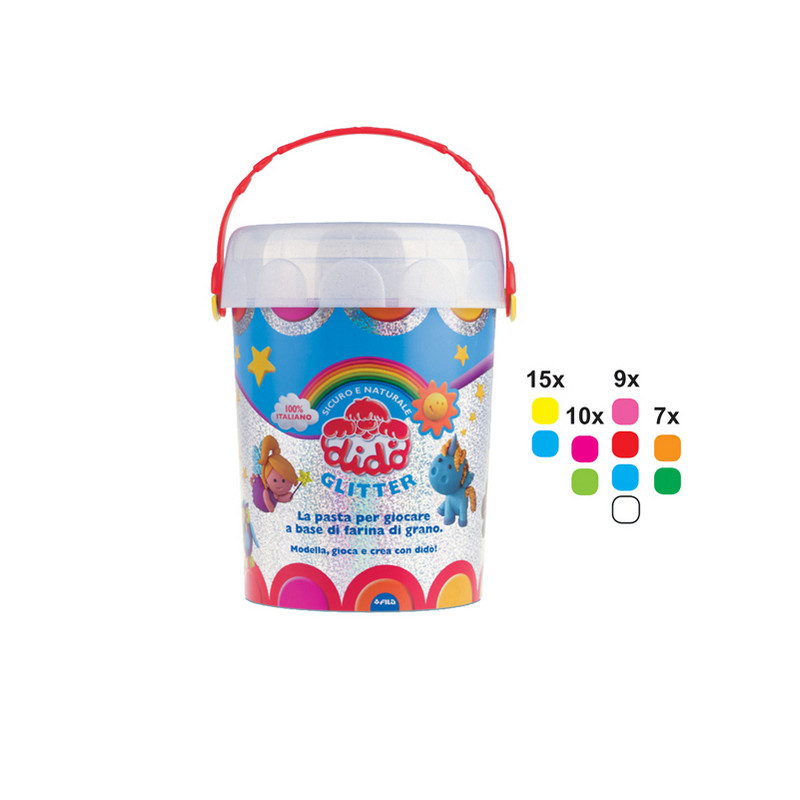 Vaso espositore con coperchio a pressione e maniglia, studiato per la vendita dei salsicciotti sfusi. L’imballo contiene al suo interno 1 vaso con 100 salsicciotti glitter da 50gr : 15 pz x giallo e azzurro chiaro, 10 pz x fucsia e verde chiaro, 9 pz x rosa, rosso, azzurro scuro e bianco, 7 pz x arancione e verde.