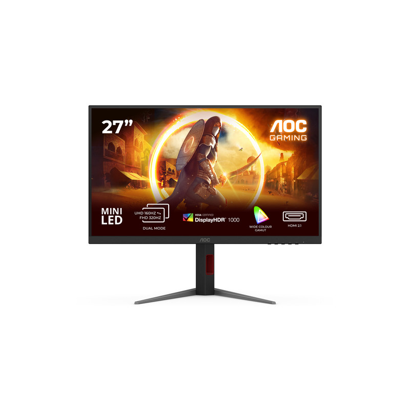 AOC G4 U27G4XM. Dimensioni diagonale schermo: 68,6 cm (27"), Risoluzione del display: 3840 x 2160 Pixel, Tipologia HD: 4K Ultra HD, Tecnologia display: LED, Tempo di risposta: 1 ms, Rapporto d'aspetto nativo: 16:9, Angolo di visualizzazione (orizzontale): 178°, Angolo di visualizzazione (verticale): 178°. Hub USB integrato, Versione dell'hub USB: 3.2 Gen 1 (3.1 Gen 1). Montaggio standard VESA, Regolazione altezza. Colore del prodotto: Nero, Rosso