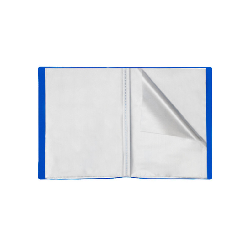 Portalistino formato A4 con copertina pesante da 400my in PPL opaco colore blu 100% riciclato e riciclabile. Buste saldate sul dorso in PPL liscio 30my 100% riciclabili.