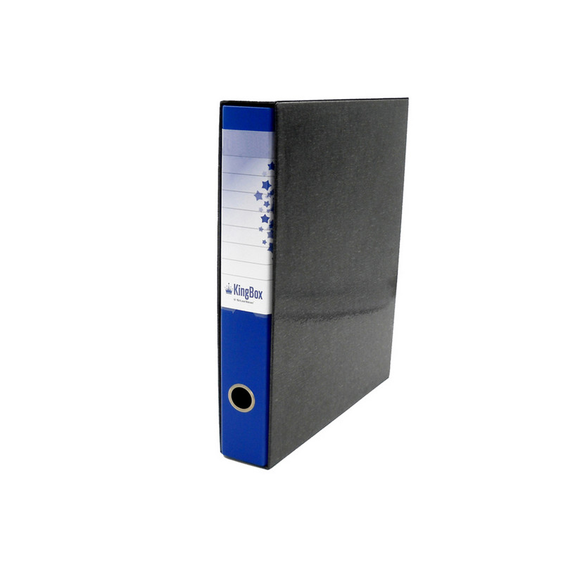 KingBox è un registratore indeformabile, lavabile e duraturo nel tempo, in cartone accoppiato da 2 mm di spessore, con rivestimento in resistente polipropilene goffrato. Dotato di propria custodia in cartone accoppiato nero, con bordi rinforzati, e di meccanismo a leva di alta qualità ancorato saldamente mediante 4 rivetti. Per agevolare la presa e facilitare l'archiviazione, KingBox presenta un anello di estrazione in acciaio nichelato (diametro 25 mm) ed una etichetta personalizzabile/scrivibile all'interno di una comoda busta termosaldata in PVC trasparente (170x100 mm), interamente fasciante il dorso.