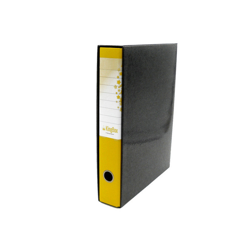 KingBox è un registratore indeformabile, lavabile e duraturo nel tempo, in cartone accoppiato da 2 mm di spessore, con rivestimento in resistente polipropilene goffrato. Dotato di propria custodia in cartone accoppiato nero, con bordi rinforzati, e di meccanismo a leva di alta qualità ancorato saldamente mediante 4 rivetti. Per agevolare la presa e facilitare l'archiviazione, KingBox presenta un anello di estrazione in acciaio nichelato (diametro 25 mm) ed una etichetta personalizzabile/scrivibile all'interno di una comoda busta termosaldata in PVC trasparente (170x100 mm), interamente fasciante il dorso.