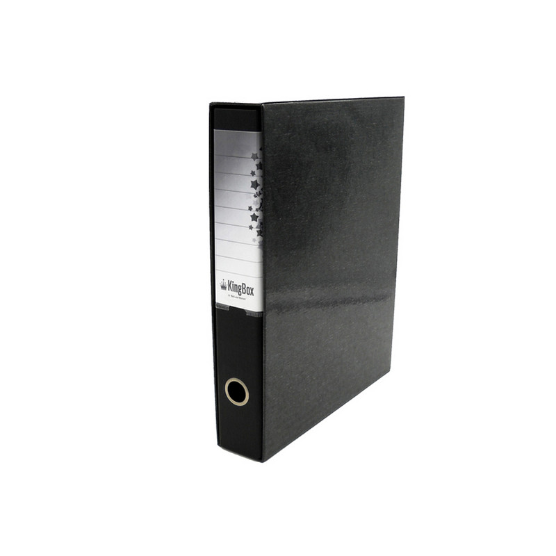 KingBox è un registratore indeformabile, lavabile e duraturo nel tempo, in cartone accoppiato da 2 mm di spessore, con rivestimento in resistente polipropilene goffrato. Dotato di propria custodia in cartone accoppiato nero, con bordi rinforzati, e di meccanismo a leva di alta qualità ancorato saldamente mediante 4 rivetti. Per agevolare la presa e facilitare l'archiviazione, KingBox presenta un anello di estrazione in acciaio nichelato (diametro 25 mm) ed una etichetta personalizzabile/scrivibile all'interno di una comoda busta termosaldata in PVC trasparente (170x100 mm), interamente fasciante il dorso.