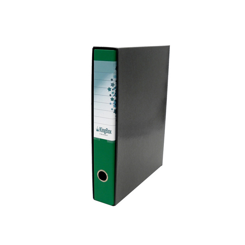 KingBox è un registratore indeformabile, lavabile e duraturo nel tempo, in cartone accoppiato da 2 mm di spessore, con rivestimento in resistente polipropilene goffrato. Dotato di propria custodia in cartone accoppiato nero, con bordi rinforzati, e di meccanismo a leva di alta qualità ancorato saldamente mediante 4 rivetti. Per agevolare la presa e facilitare l'archiviazione, KingBox presenta un anello di estrazione in acciaio nichelato (diametro 25 mm) ed una etichetta personalizzabile/scrivibile all'interno di una comoda busta termosaldata in PVC trasparente (170x100 mm), interamente fasciante il dorso.