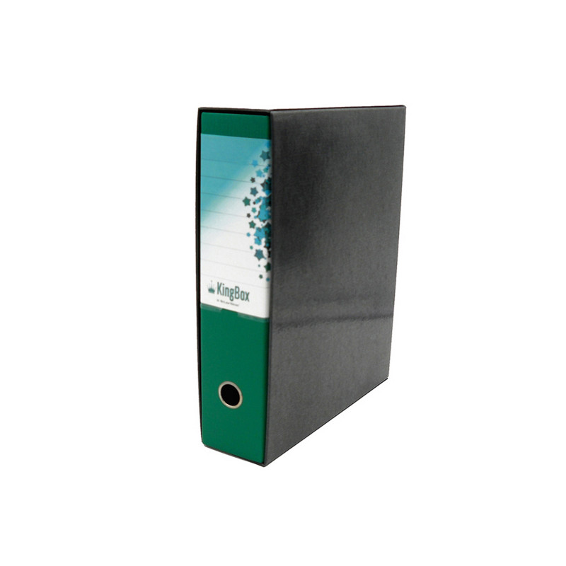 KingBox è un registratore indeformabile, lavabile e duraturo nel tempo, in cartone accoppiato da 2 mm di spessore, con rivestimento in resistente polipropilene goffrato. Dotato di propria custodia in cartone accoppiato nero, con bordi rinforzati, e di meccanismo a leva di alta qualità ancorato saldamente mediante 4 rivetti. Per agevolare la presa e facilitare l'archiviazione, KingBox presenta un anello di estrazione in acciaio nichelato (diametro 25 mm) ed una etichetta personalizzabile/scrivibile all'interno di una comoda busta termosaldata in PVC trasparente (170x100 mm), interamente fasciante il dorso.