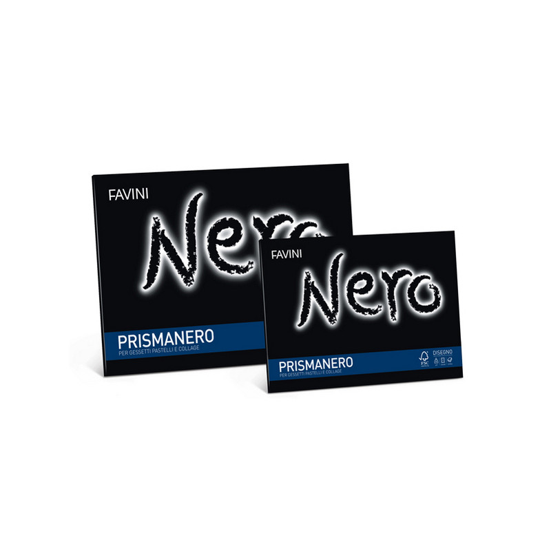 Album da 10 fogli in cartoncino monoruvido Prisma Favini nero da 128gr.Adatto per pastelli, gessetti e collage. Rilegatura a punto metallico e perforazione a stacco. Formato 24x33cm.