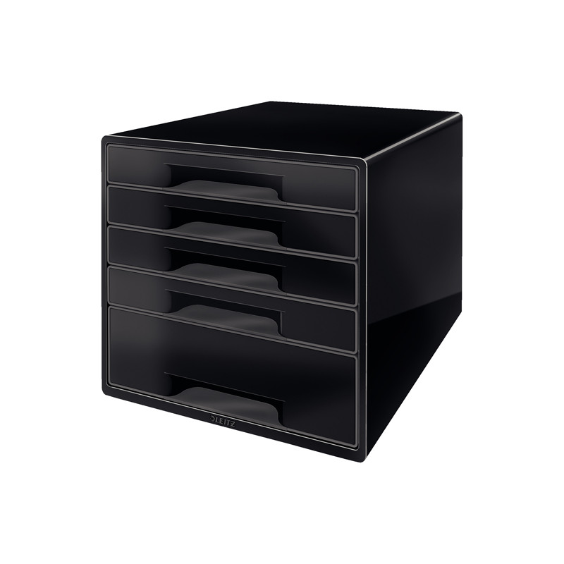 Cassettiera Black & White da 5 cassetti: 4 cassetti poco profondi + 1 cassetto alto per accessori da scrivania, come cucitrice, dispositivi mobili, ecc. Cassettiere impilabili fino a 3 moduli. Ergonomico buco presa nella parte inferiore del cassetti poco profondi per una facile rimozione dei documenti. Dimensioni utili: cassetti bassi L245x H34xP325mm, cassetto alto L245xH71xP325mm. Peso Kg3,59. Piedini in gomma. Dimensioni L287xH270xP363mm.