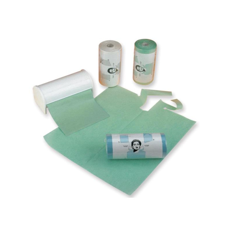 Rotolo di bavagli a due strati, uno di tessuto in cellulosa ultra-assorbente ed uno in polietilene resistente all’acqua.