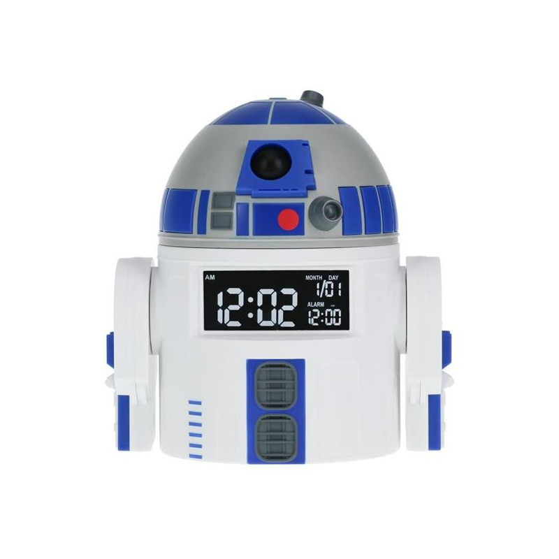 Inizia la giornata in modo pratico e giocoso con questa sveglia R2-D2. La sveglia a forma di droide, alta 13 cm (5'), è dotata di un display digitale che indica l'ora e la data. Riproduce i suoni ufficiali di R2-D2 per svegliarvi al mattino.
