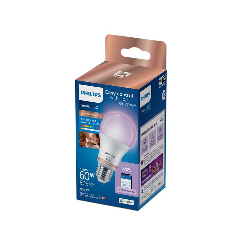 Philips Lampadina 8,5 W (Eq.60 W) A60 E27. Tipo: Lampadina intelligente, Interfaccia: Wi-Fi/Bluetooth, Colore del prodotto: Bianco. Sistema operativo mobile supportato: Android, iOS. Classe efficienza energetica: F, Consumo di energia per 1.000 ore: 9 kWh, Tipologia alimentazione: AC. Larghezza: 60 mm, Profondità: 60 mm, Altezza: 122 mm. Tipo di imballo: Scatola, Larghezza imballo: 7 mm, Profondità imballo: 7 mm