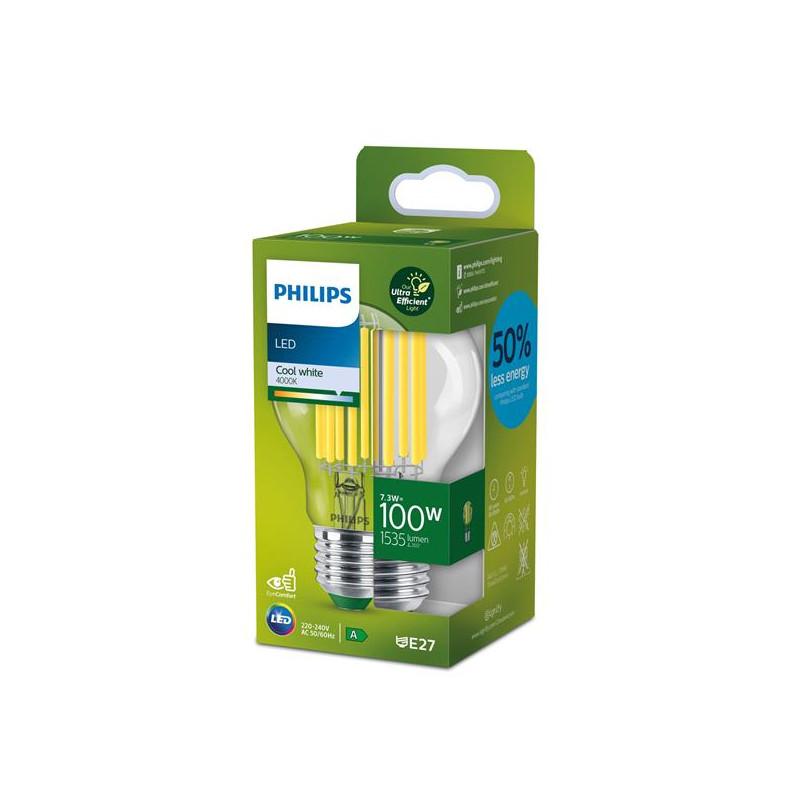 Philips Lampadina trasparente a filamento 100 W A60 E27. Potenza lampadina: 7,3 W, Lampadina di potenza equivalente: 100 W, Attacco lampada: E27, Flusso luminoso: 1535 lm, Durata della lampadina: 50000 h, Colore della luce: Bianco freddo, Temperatura colore: 4000 K, Color Rendering Index (CRI): 80, Fattore di potenza: 0,4