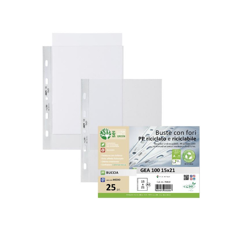 Buste in PP buccia, riciclato e riciclabile, con foratura universale rinforzata. Spessore medio. Confezione compostabile al 100%. Ideali per archiviare qualsiasi tipo di documento, con un particolare pensiero alla sostenibilità.