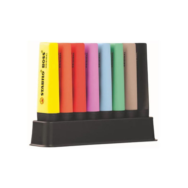 Questo set da scrivania comprende 8 evidenziatori STABILO BOSS ORIGINAL: 1 marcatore nero, 1 colore ispirato alla natura, 2 fluo e 4 Pastel.