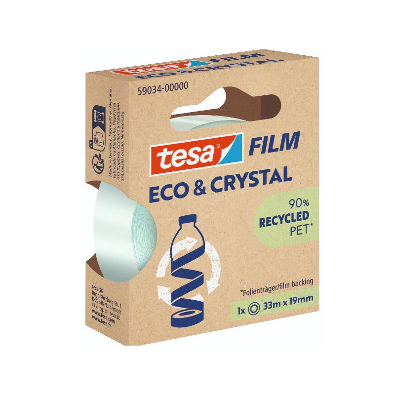 Eco & crystal, un nastro che combina le caratteristiche di un tesafilm® classico con un contributo ecologico. Altamente trasparente, versatile, dotato di un adesivo forte e privo di solventi, con materiale di supporto realizzato al 90% con bottiglie in PET riciclate. Inoltre,il nucleo del rotolo è costituito al 100% da plastica riciclata e può essere srotolato in modo silenzioso. Compatibile con tutti i dispenser di nastro tesafilm®.