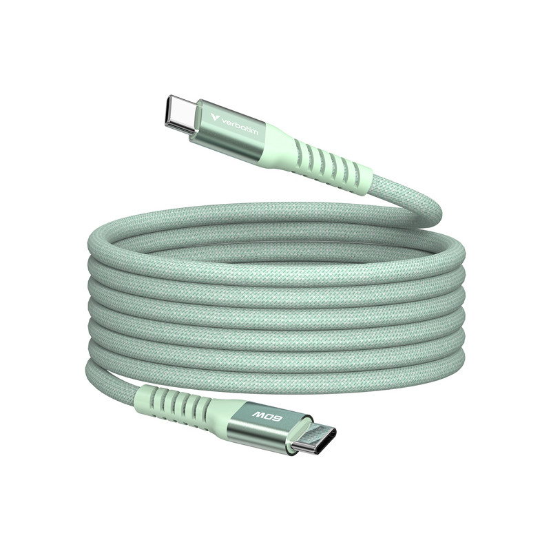 Verbatim Cavo Magnetico Sync <(>&<)>Charge USB-C to USB-C 60W 120 cm_Verde Caricamento e trasferimento dati veloci: supporta un'erogazione di energia fino a 60 W e una velocità di trasferimento dati di 480 Mbps Compatibilità universale: Carica e sincronizza un'ampia gamma di dispositivi USB-C ® , tra cui smartphone, tablet e laptop Design magnetico senza grovigli: rimane arrotolato e organizzato per una facile conservazione e portabilità Durevole esterno intrecciato: resiste a oltre 30.000 curve per una maggiore durata Supporta PD 3.0 e QC 3.0: Assicura la compatibilità con i moderni standard di ricarica Leggero e portatile: Perfetto per i viaggi e l'uso quotidiano Interfacce: Connettore USB-C (maschio) Lunghezza cavo: 120 cm Diametro cavo: 4,6 mm Materiale: Alluminio, nylon, TPE Velocità di trasferimento dati: fino a 480Mbps Potenza in uscita: max. 60W Supportato: PD 3.0, QC 3.0