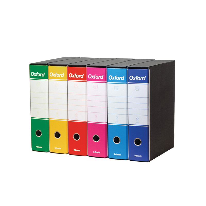 I 6 colori disponibili sono i seguenti: verde, giallo, rosso, fucsia, azzurro e blu. I 6 registatori OXFORD G85 sono adatti all'archiviazione di un massimo di 500 fogli da 80 g per m² per ciascun registratore, in formato 23x33, sono comodi da utilizzare e facili da organizzare. Ogni registratore presenta una struttura in cartone da 2 mm rivestito in carta goffrata e bande metalliche di rinforzo che mantengono i bordi della custodia ottimamente diritti. I registratori sono prodotti in Italia e certificati FSC Mix. Personalizzazione sul fronte per identificare il contenuto dei registratori.