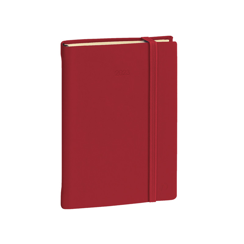 Agenda giornaliera tascabile, un giorno per pagina. 12 mesi da gennaio a dicembre, schema multilingue e pagine note intercambiabili, tasca con soffietto portabiglietti. Carta color avorio certificata PEFC stampa bicolore, rilegatura cucita e chiusura con elastico.