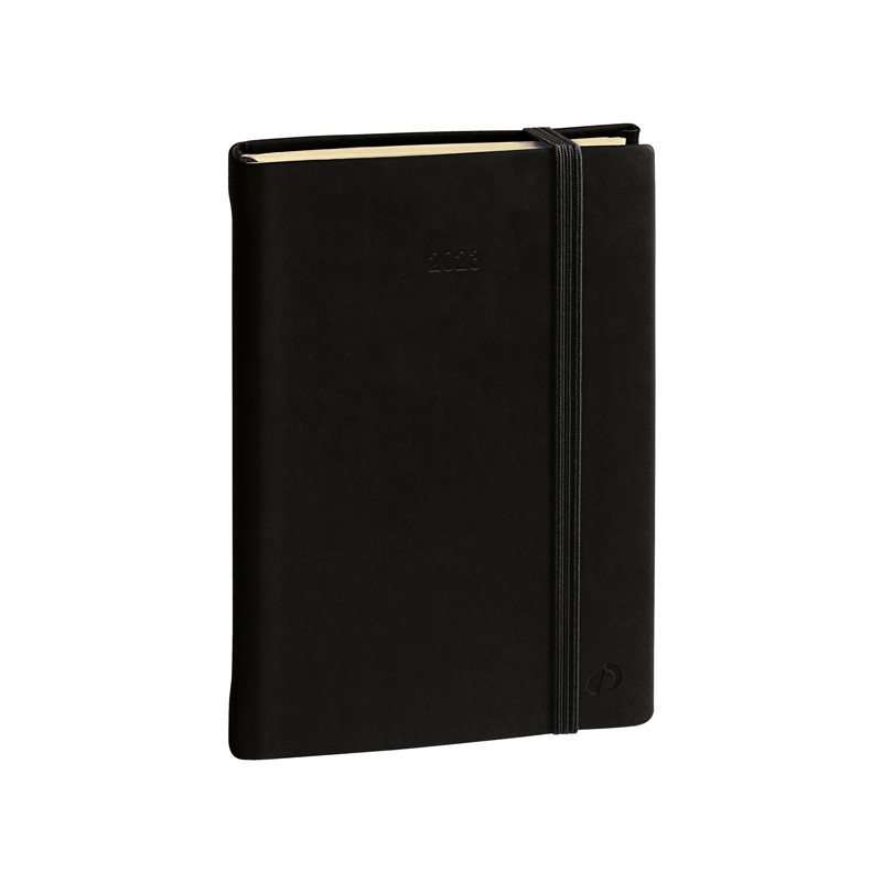 Agenda settimanale da ufficio, una settimana su due pagine. 13 mesi d dicembre a dicembre, pagine note intercambiabili, multilingue. Dotata di tasca a soffietto portabiglietti, chiusura con elastico verticale. Carta avorio certificata PEFC, stampa bicolore, rilegatura cucita.