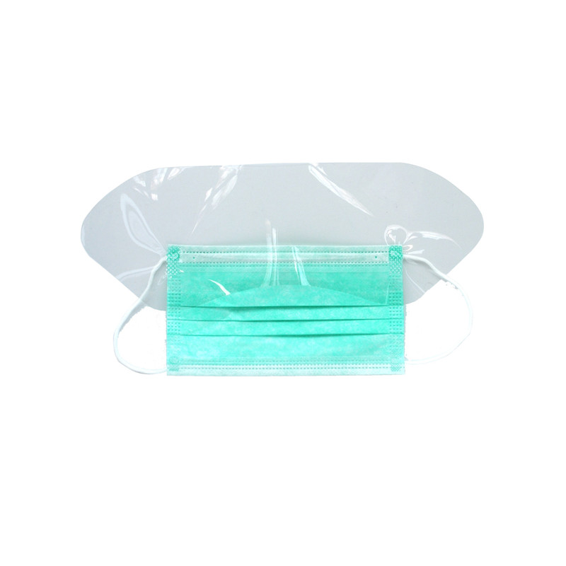 Mascherina chirurgica 3 strati con visiera paraschizzi ed elastici auricolari. La visiera è in poliestere antiappannante. Imbustata singolarmente, non sterile. Per la Direttiva 93/42/CEE sui Dispositivi Medici la Classe di appartenenza è classe I. Repertorio dei Dispositivi Medici n. 92361 registrato sul portale dei Dispositivi Medici.