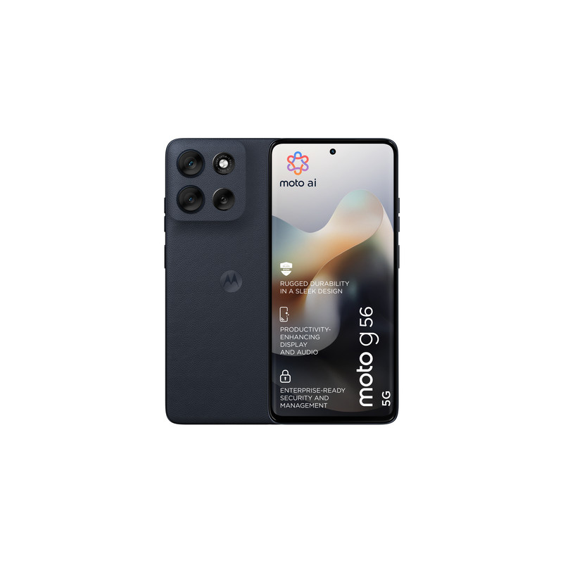 Motorola moto g56 5G . Dimensioni diagonale schermo: 17,1 cm (6.72"), Risoluzione del display: 2400 x 1080 Pixel. Frequenza del processore: 2,6 GHz, Famiglia processore: MediaTek Dimensity, Modello del processore: 7060. Capacità della RAM: 8 GB, Capacità memoria interna: 256 GB. Risoluzione fotocamera posteriore (numerico): 50 MP, Tipo di fotocamera posteriore: Doppia fotocamera. Capacità della scheda SIM: Dual SIM ibrida. Sistema operativo incluso: Android 15. Capacità della batteria: 5200 mAh. Colore del prodotto: Nero. Peso: 200 g
