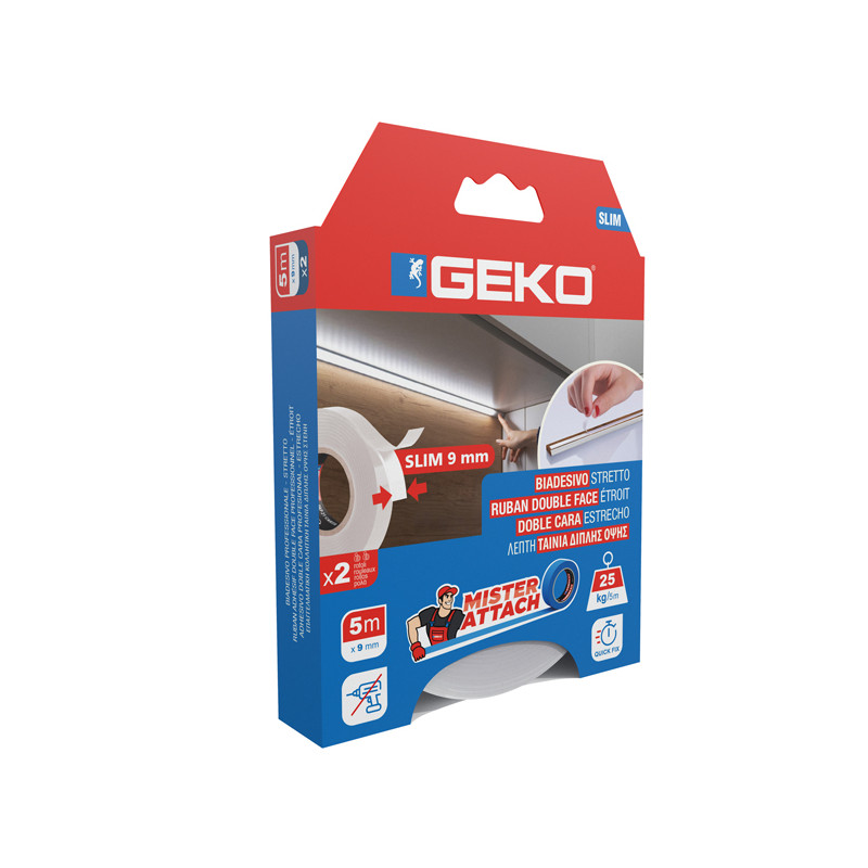 Nastro biadesivo Mister Attach Slim in schiuma PE bianca spessore 1,10mm con adesivo acrilico sensibile alla pressione su entrambi i lati. Liner: Carta bianca. Adesivo: acrilico modificato. Principali applicazioni: indicato per tutte le applicazioni verticali in interno, con carico moderato. Usato per adesivizzare plastica, carta, cartoni, targhe, guarnizioni su metallo. Buona resistenza a plastificanti, oli, solventi e molto buona resistenza ai prodotti chimici, raggi UV e umidità. Dimensioni: 9mmx5m.