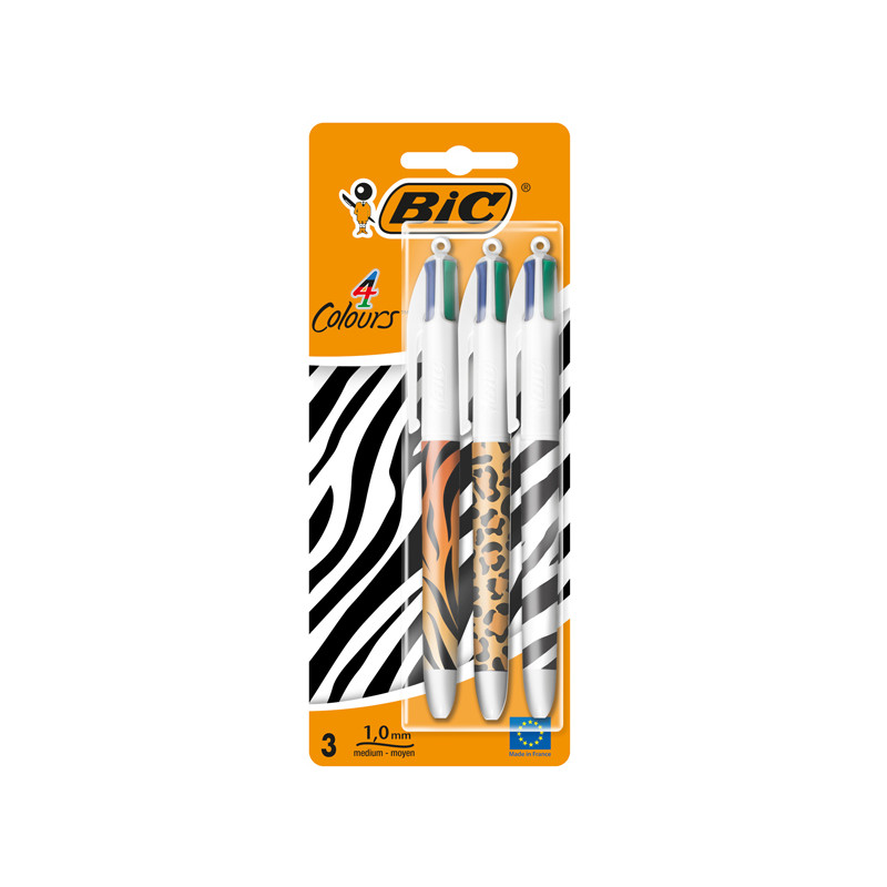 Penna a sfera BIC® 4 Colori con inchiostri classici (nero, blu, rosso, verde). Confezione assortita con 3 fusti dalle fantasie Animalier (tigre, zebra, ghepardo) che si ispirano ai trend di moda per accessori ed abbigliamento. Punta 1mm.