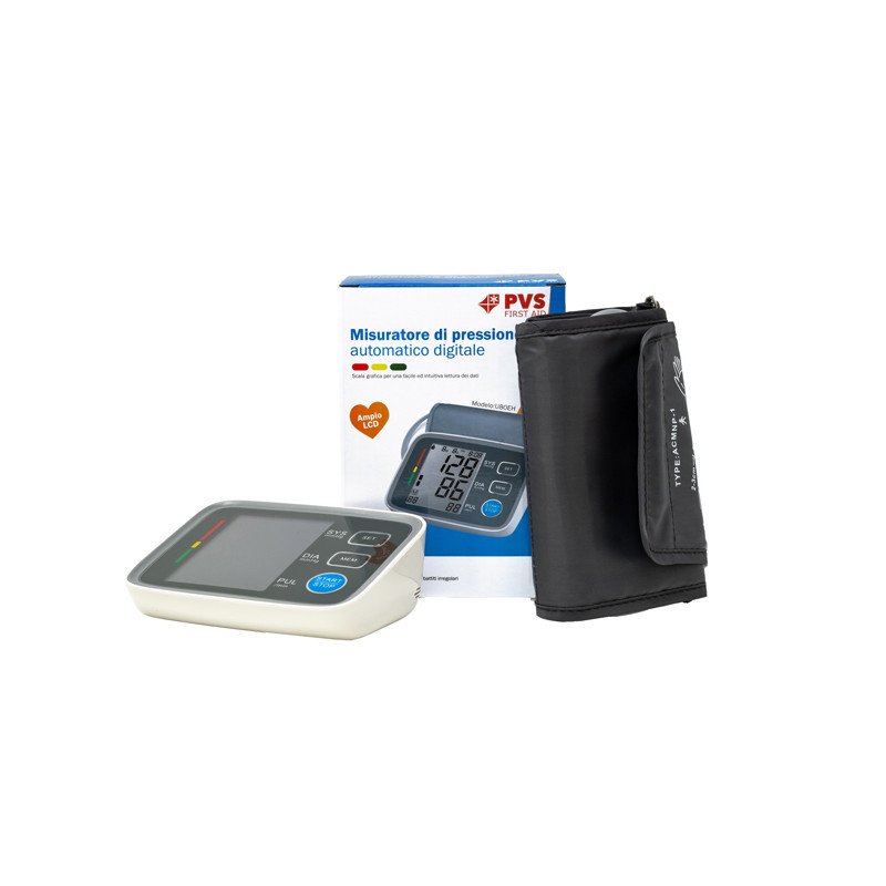 Sfigmomanometro digitale da braccio per la misurazione della pressione sanguigna con LCD display. Il principio di misurazione è con metodo oscillometrico. La misurazione della pressione sanguigna avviene nella parte superiore del braccio; può memorizzare fino a 2x90 misurazioni. Funziona con 4 Batterie Alcaline AA (COMPRESE) o adattatore AC (non compreso) e prevede lo spegnimento automatico dopo 3 minuti di inutilizzo.Dimensioni: 132mm×100mm×45mm. Numero di Repertorio 2057410 – CND ZI203020599 classe IIA.