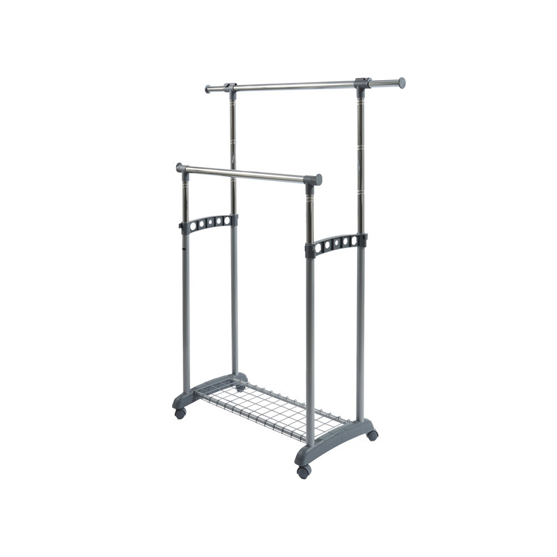 Appendiabiti multiuso facile da trasportare e comodo da usare. Con ampia base di appoggio e tubi estensibili per aumentarne la capacità. Può essere usato come appendiabiti dopo la stiratura, come stendibiancheria per capi ingombranti o in alternativa al classico armadio. Si assembla facilmente senza l'uso di utensili. Dotato di ruote e griglia porta scatole. 2 barre. Misure: base cm 88 estensibile fino a cm 147, altezza cm 94 estensibile fino a cm 166.