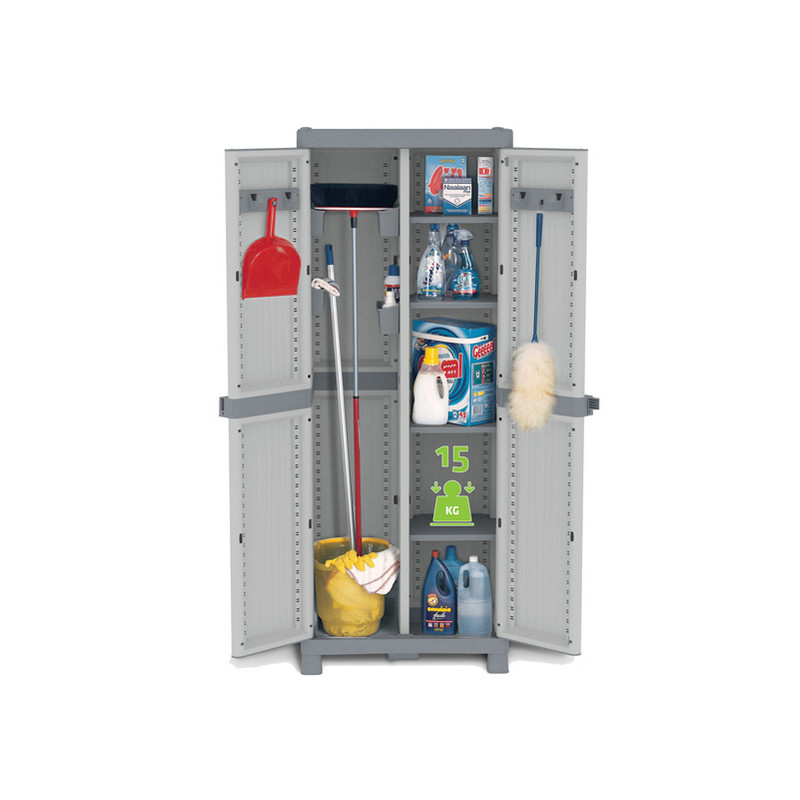 Armadio a due ante con divisorio verticale, 4 ripiani regolabili (portata 15kg), 4 vaschette e 2 appenditutto. Possibilità di chiusura con lucchetto (non incluso). Dimensioni (lxpxh): 70x43,8x181,8 cm.. Domino wave Þ un sistema modulare componibile con struttura solida in polipropilene, stabile e duratura nel tempo. I ripiani sono interamente regolabili in altezza tramite l'apposita cremagliera. Chiusura lock system che assicura il mantenimento della chiusura delle porte anche contro vento e pioggia. Fornito smontato.