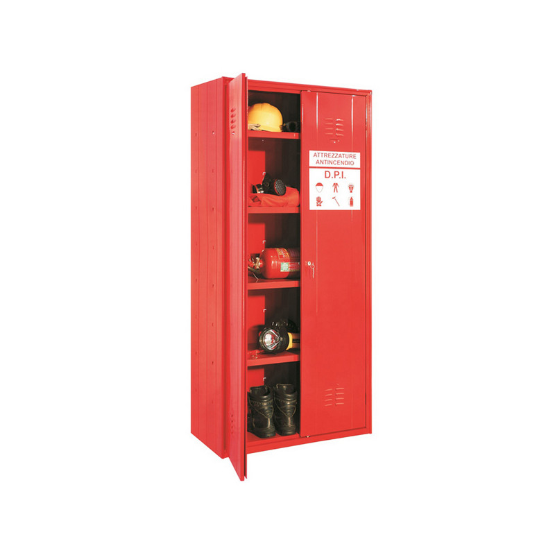 Armadio tutto piani monoblocco (elettro-puntato non assemblato) per contenimento dispositivi di protezione individuale. Struttura portante realizzata in lamiera d’acciaio profilata prima scelta spessore 6/10. Ante speciali rinforzate e dotate di feritoie di aerazione nella parte superiore ed inferiore. Cerniere interne speciali antiscasso con perno di rotazione interno invisibile ad anta chiusa. Costituito da 1 vano da 4 ripiani interni rettangolari regolabili su asole in 8 posizioni differenti. Adesivo di identificazione su anta. Porta cartellino in materiale plastico applicato all’anta Chiusura con serratura a cilindro con doppia chiave in dotazione. Fornito montato.
