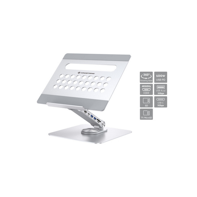 Conceptronic DONN27G, Supporto per computer portatile, Argento, Alluminio, 360°, USB 3.2 Gen 1 (3.1 Gen 1) Type-C, 5000 Mbit/s