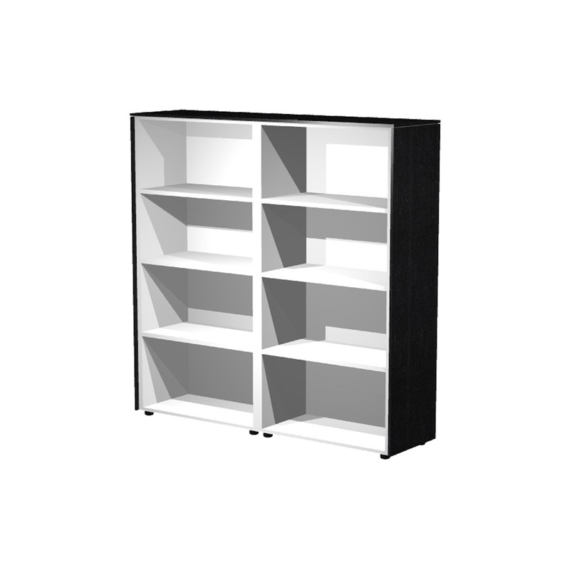 Struttura colore grigio alluminio. Top e fianchi finitura (sp. 14 mm) colore nero venato frassino e ciliegio arabis. Top, base e fianchi sp. 18 mm. Ripiani regolabili in altezza sp. 25 mm. Schiena sp. 10 mm. Piedini livellabili dall’interno. Disponibili moduli singoli e doppi con top finitura unico. I mobili possono essere allestiti a giorno o completi di ante con serratura. COPPIA Mobili medio-alti a giorno, 6 ripiani spostabili. L162,8 x P43 x H158,2cm.