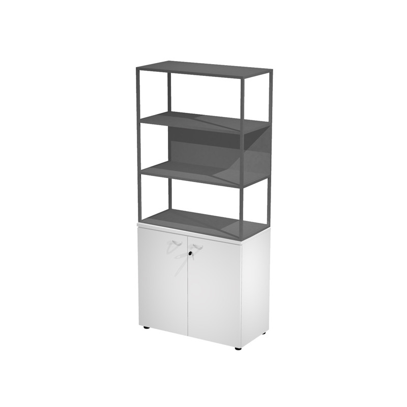 Libreria in metallo a 3 vani con struttura 20x20 mm a giorno con ripiani, base, cappello e un dietro in melaminico , sovrapposta ad un armadio basso, completo di ante battenti con serratura. Libreria metal completa di 1 dietro in melaminico posizionabile a scelta in fase di montaggio. Dimensioni: 90x46xH204cm
